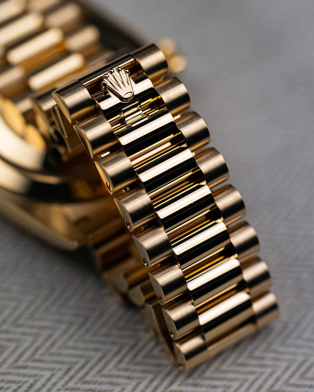 Luminescent Yellow Gold Hands and Index Hour Markers. The Day and Date Displayed on a Champagne Dial.